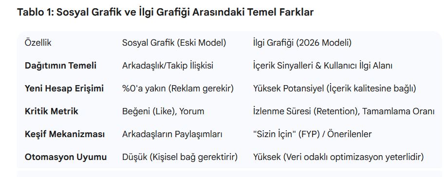 2026 yılı itibarıyla hakim olan model ise "İlgi Grafiği"dir (Interest Graph). Bu modelde, platformun önceliği kullanıcılar arasındaki ilişki değil, kullanıcının içerikle olan ilişkisidir. Algoritma, videoyu yükleyen hesabın 0 takipçisi olmasını bir engel olarak görmez. Aksine, her yeni içerik, platformun envanterine giren bağımsız bir veri birimi olarak değerlendirilir ve potansiyel alıcısıyla (izleyici) eşleştirilmeye çalışılır.