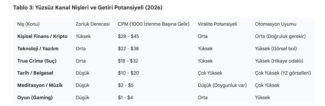 Her konu viral olsa da, her konu para kazandırmaz. 50.000 kanal üzerinde yapılan analizler, 2026 için en karlı "yüzsüz" nişleri şöyle sıralamaktadır: